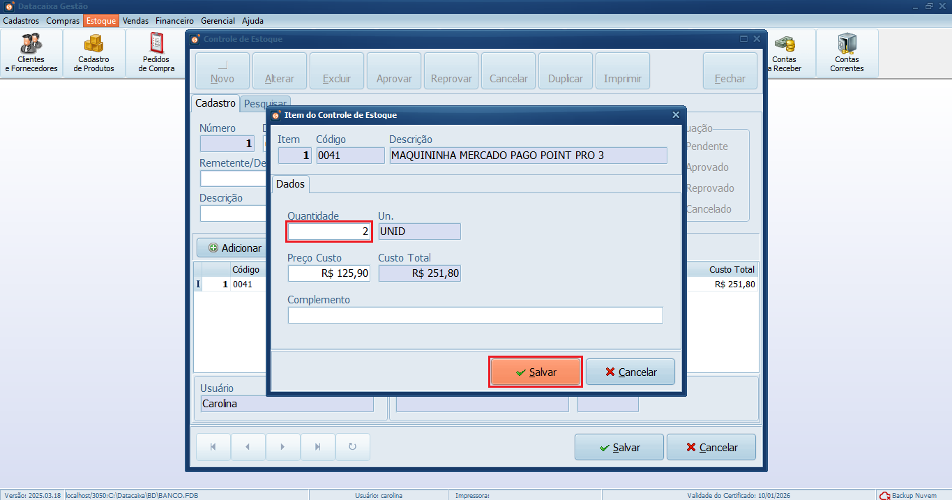 6- Defina a Quantidade do item. Em seguida, clique em Salvar.