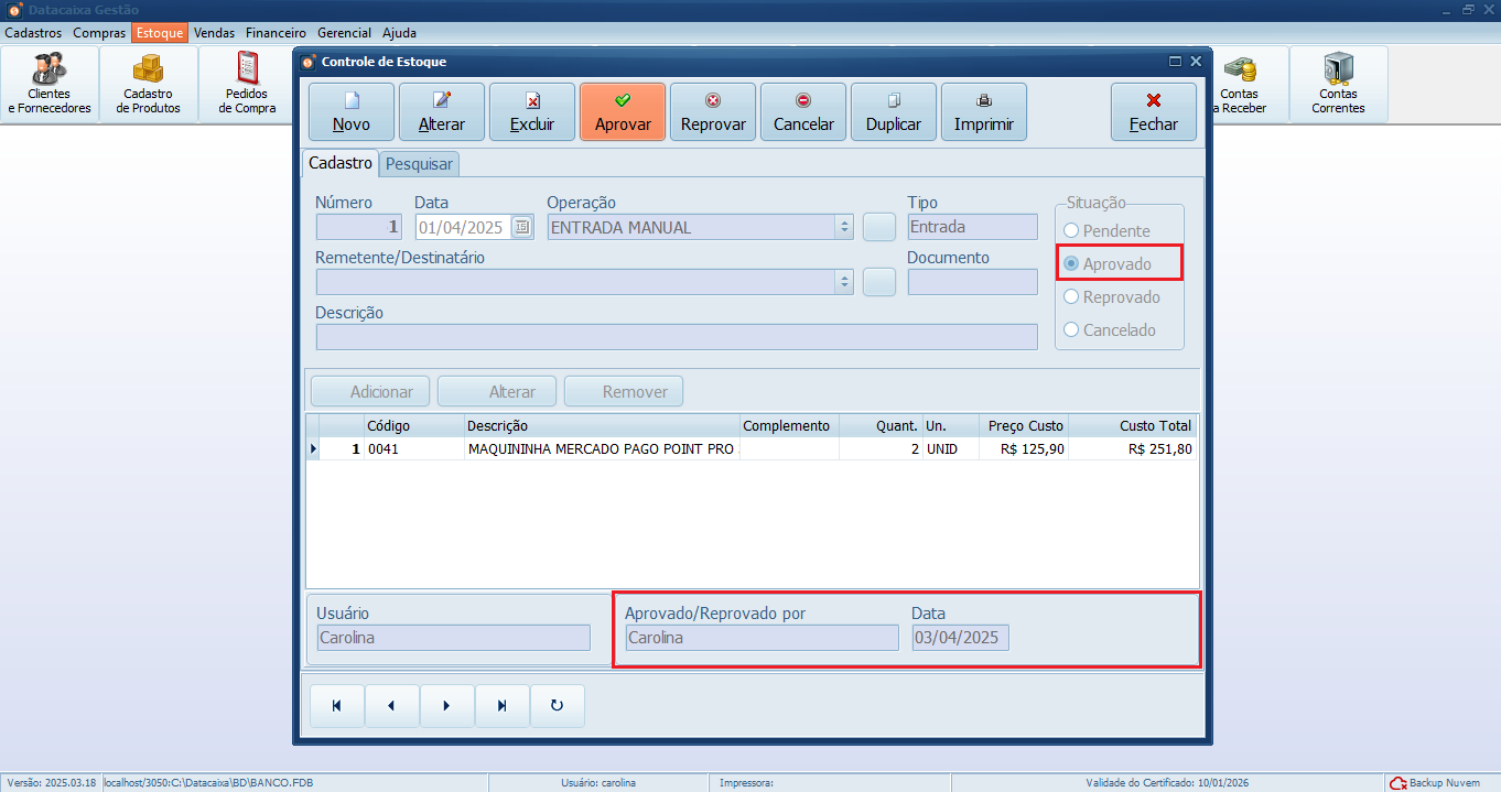Após Aprovado, será registrado automaticamente o responsável pela aprovação e a data em que foi realizada.