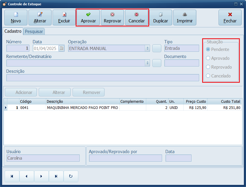 A aprovação ou reprovação da movimentação de estoque depende das permissões do usuário. Ou seja, um usuário pode ter permissão apenas para cadastrar uma Entrada ou Saída no Controle de Estoque, enquanto outro pode Aprovar ou Reprovar essa movimentação.