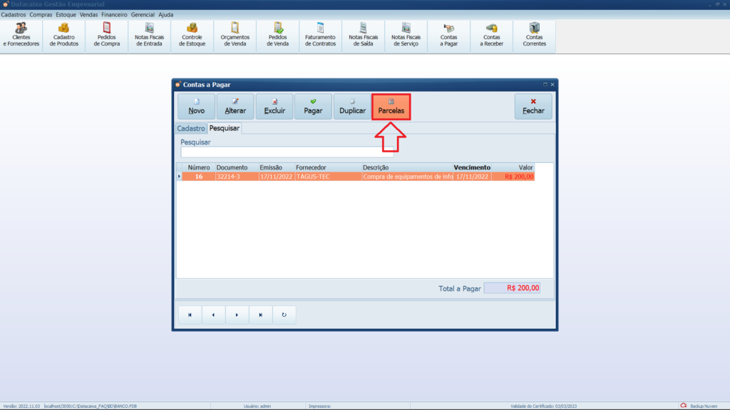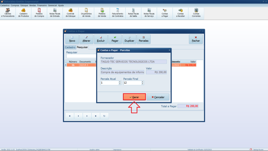 Ao cadastrar uma conta a pagar que terá parcelas, saiba que não se deve cadastrar com o valor final a ser pago e sim com o valor de cada parcela, no exemplo do artigo temos uma conta a pagar com doze parcelas de R$ 200,00, com o total valor a ser pago de R$ 2.400,00.