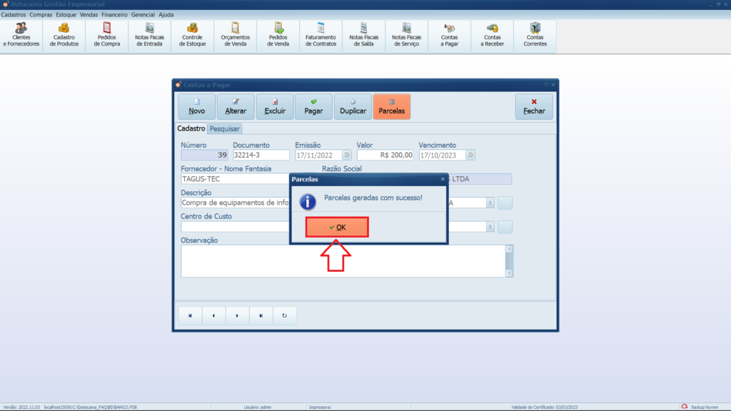 5- Parcelas geradas com sucesso, clique em OK.