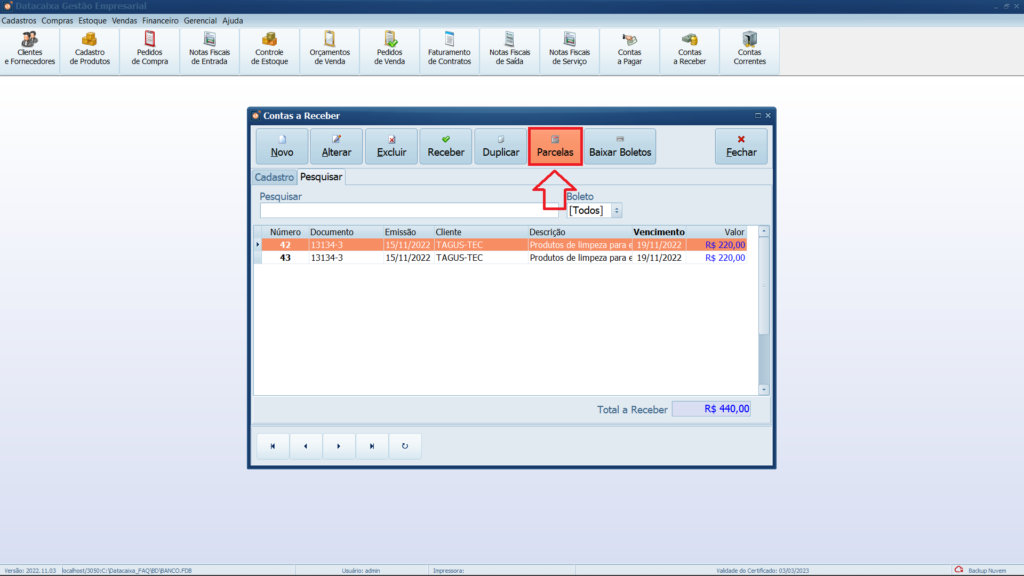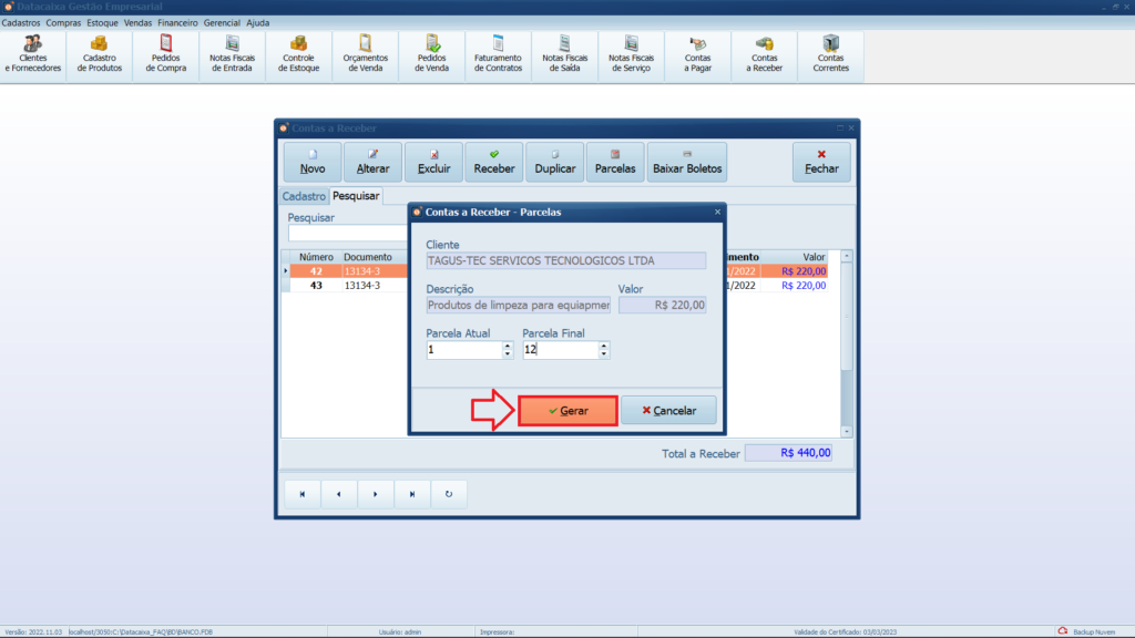 Ao cadastrar uma conta a receber que terá parcelas, saiba que não se deve cadastrar com o valor final a ser faturado e sim com o valor de cada parcela, no exemplo do artigo temos uma conta a receber com doze parcelas de R$ 220,00, com o total a receber de R$ 2.640,00.