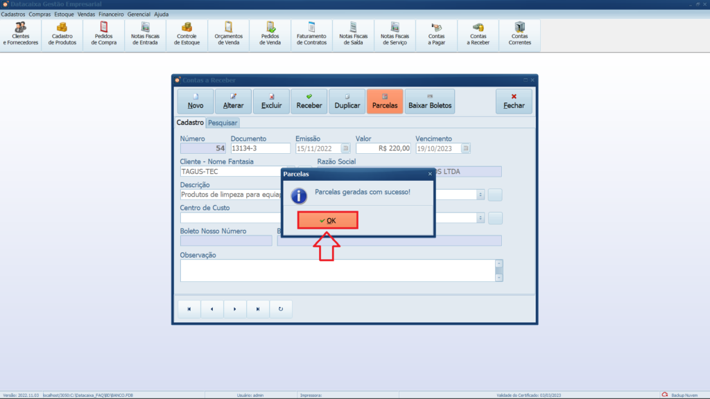 5- Parcelas geradas com sucesso, clique em OK.