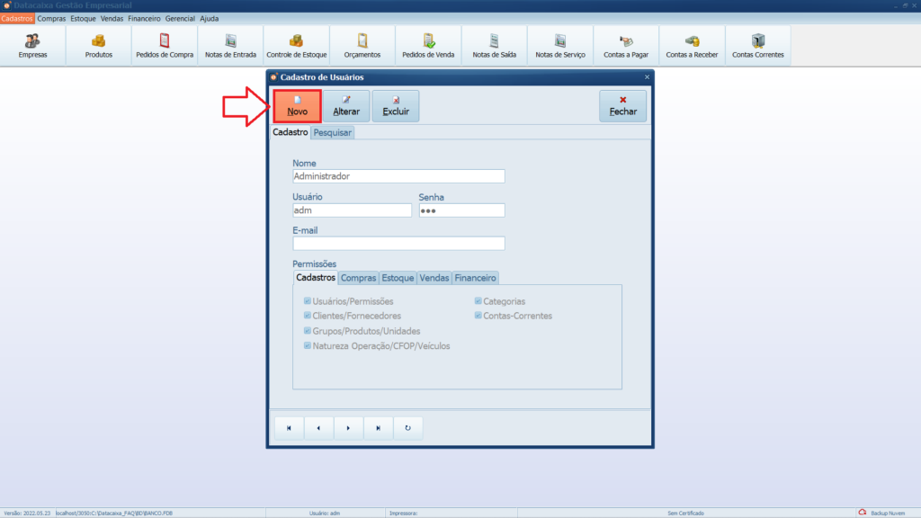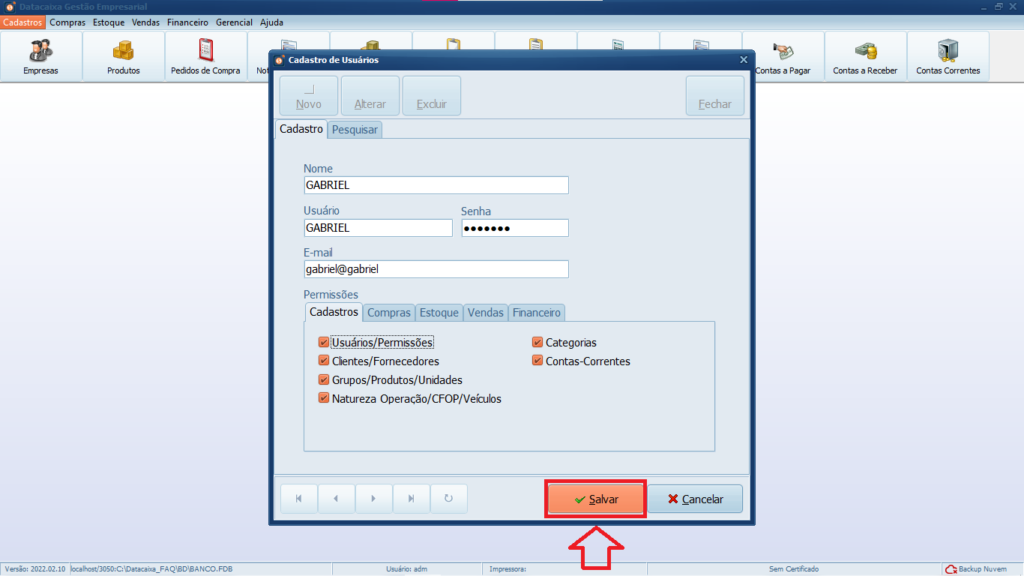 4- Preencha os dados do Usuário, defina suas Permissões e clique em Salvar.