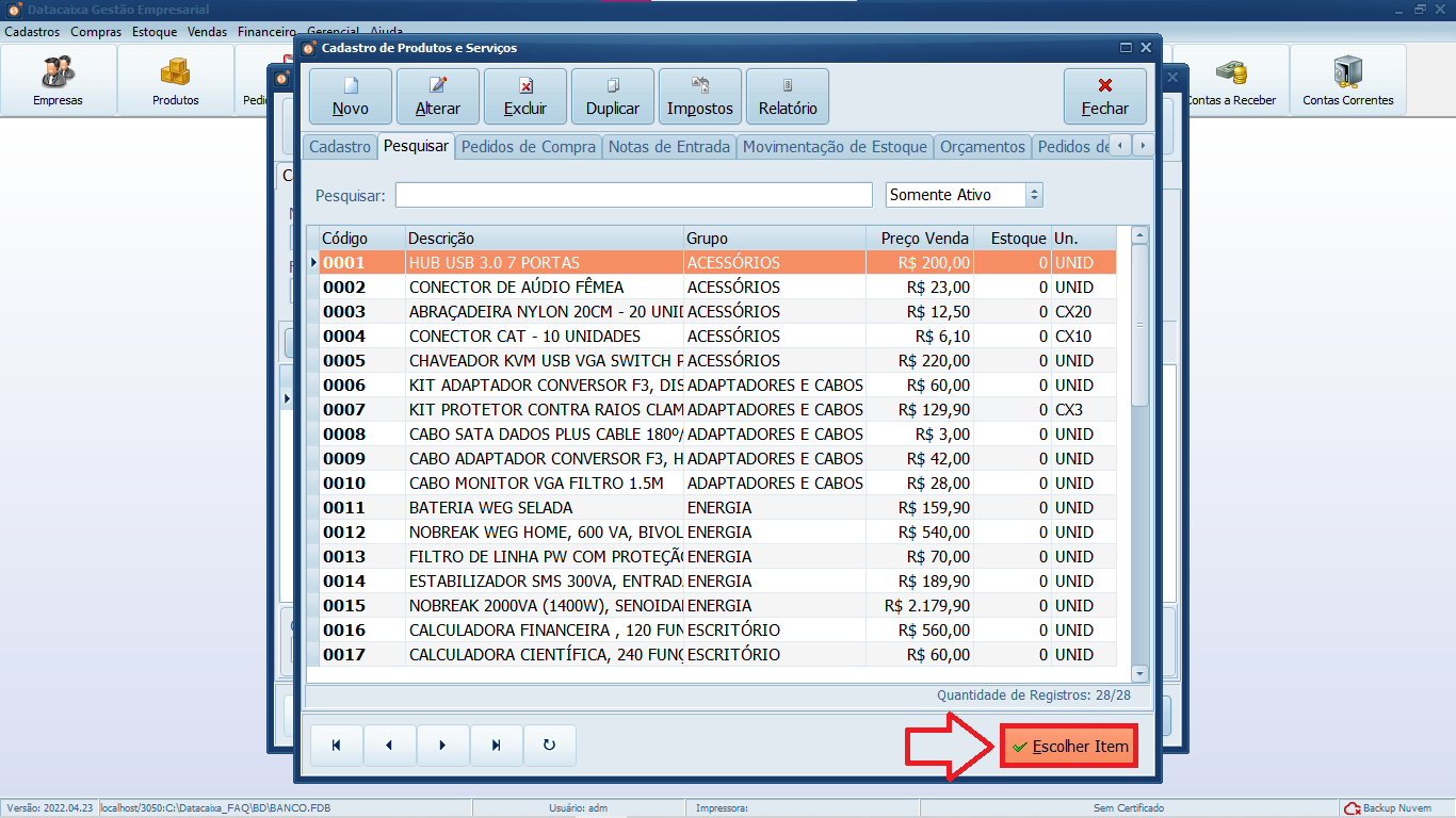 4- Selecione o Produto que deseja incluir no Pedido e clique em Escolher Item.