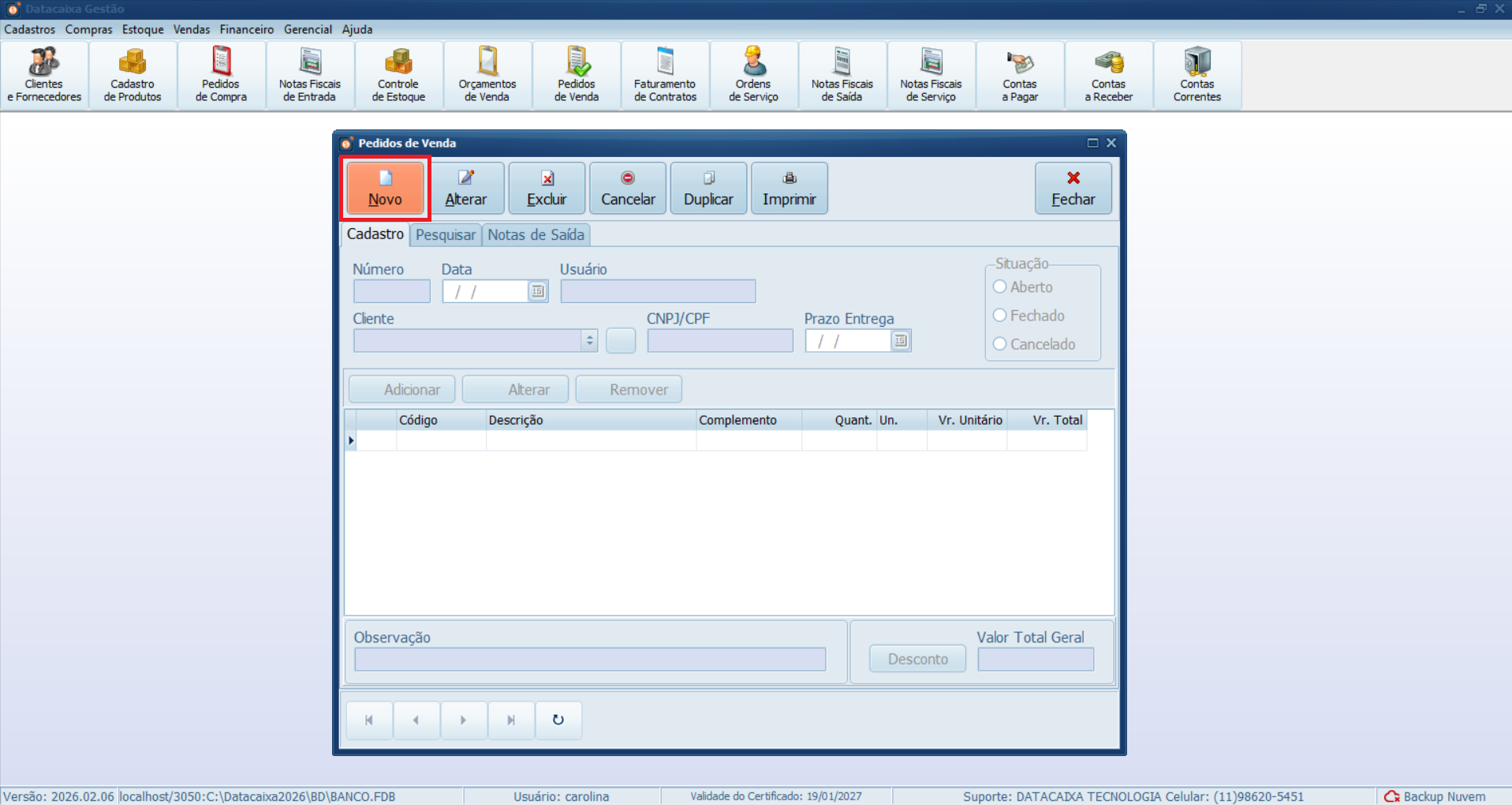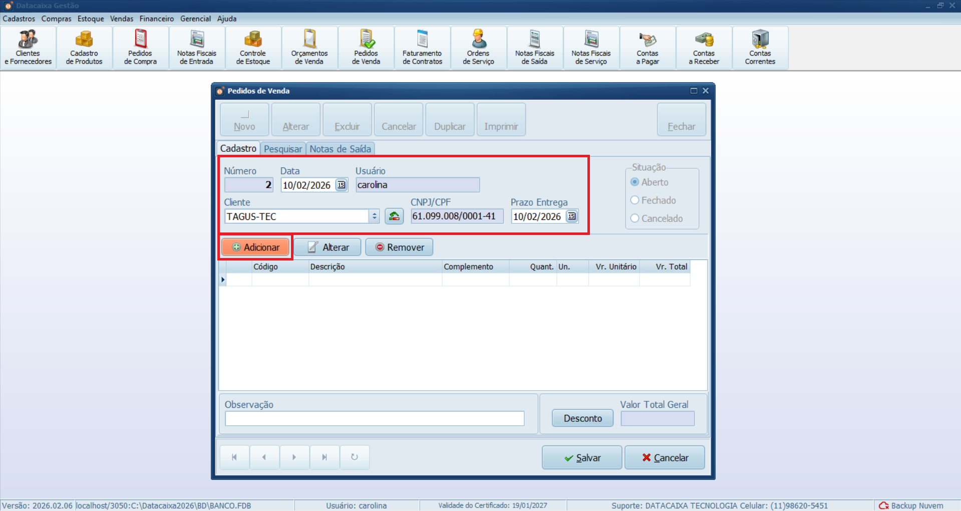 3- Preencha os dados do Pedido e Clique em Adicionar.