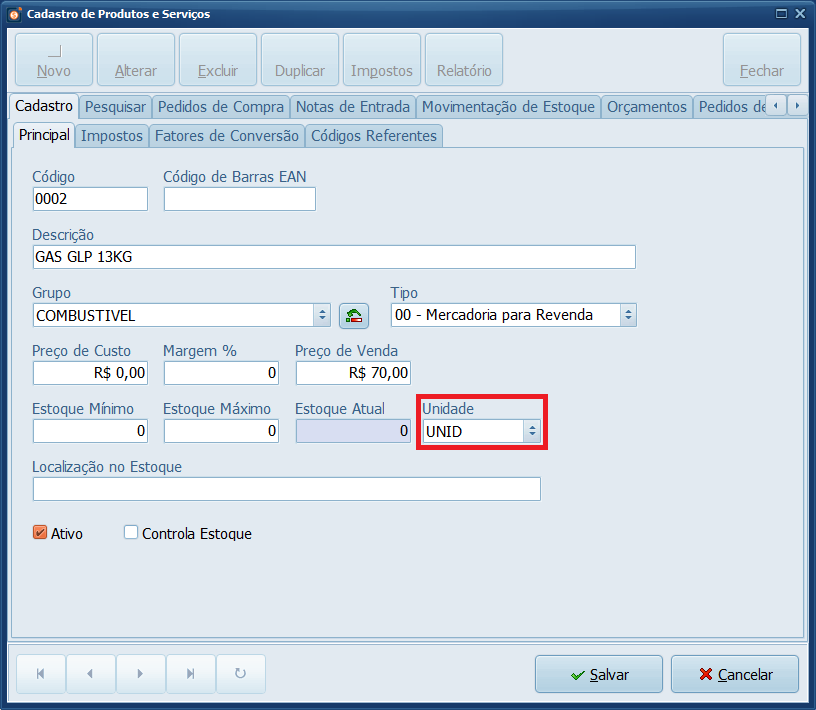 4- Na aba Fatores de Conversão, como estamos trabalhando com Unidade UNID no produto deste exemplo, precisamos atualizar a Unidade Tributável informando que 1 UNID equivale a 13 KG, ou o peso do GAS que vende no estabelecimento.