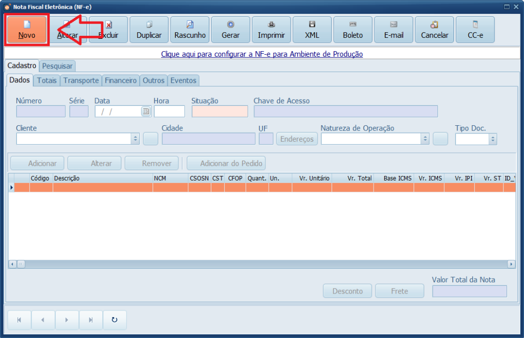 1- Em Notas Fiscais de Saída, clique em Novo.