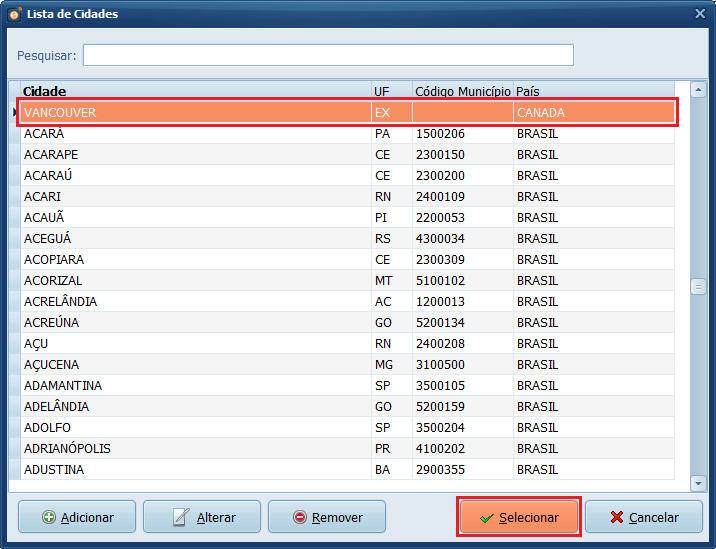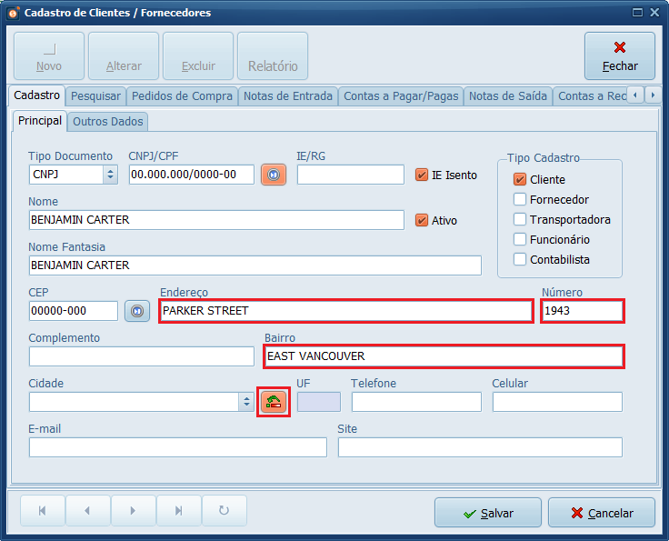 6- Selecione o registro da Cidade e clique em Selecionar. Se desejar, preencha as informações de contato do cliente. Depois, clique em Salvar.
