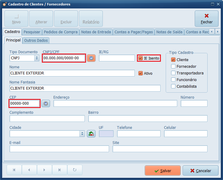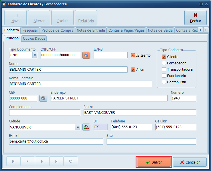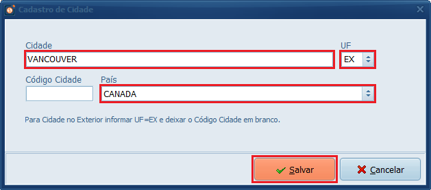 5- Preencha o nome da Cidade, em UF selecione EX e defina o País. Depois, clique em Salvar.
