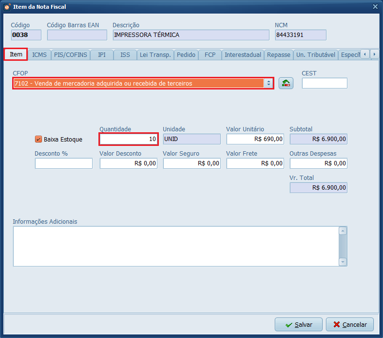 8- Adicione o produto desejado. Na aba Item, selecione um CFOP iniciado em 7 e defina a Quantidade do produto.