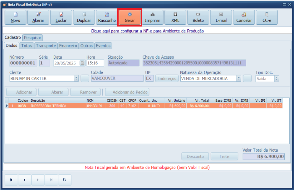 Pronto! Você gerou uma NF-e para o exterior.