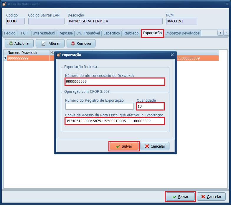 11- Clique na aba Exportação. Em seguida, clique em Adicionar. Preencha o Número do ato concessório de Drawback, informe a Quantidade e a Chave de acesso da Nota Fiscal que efetivou a Exportação. Depois, clique em Salvar > Salvar.