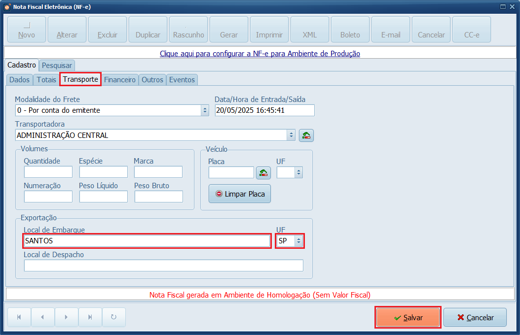 12- Na aba Transporte, informe o Local de Embarque e o UF (Estado) > Salvar.
