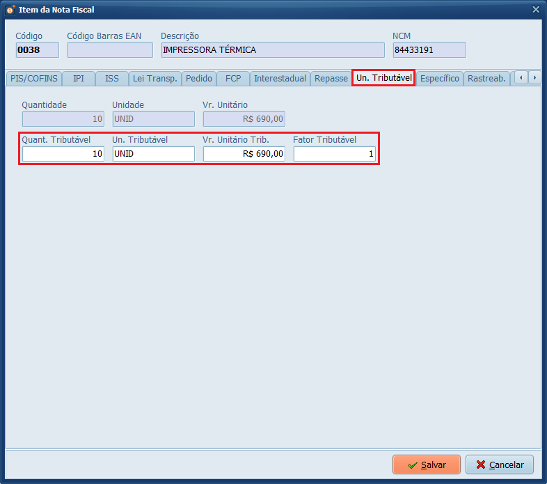 10- Confirme na aba Un. Tributável se a unidade está conforme a Tabela de Comércio Exterior evitando a Rejeição 817.