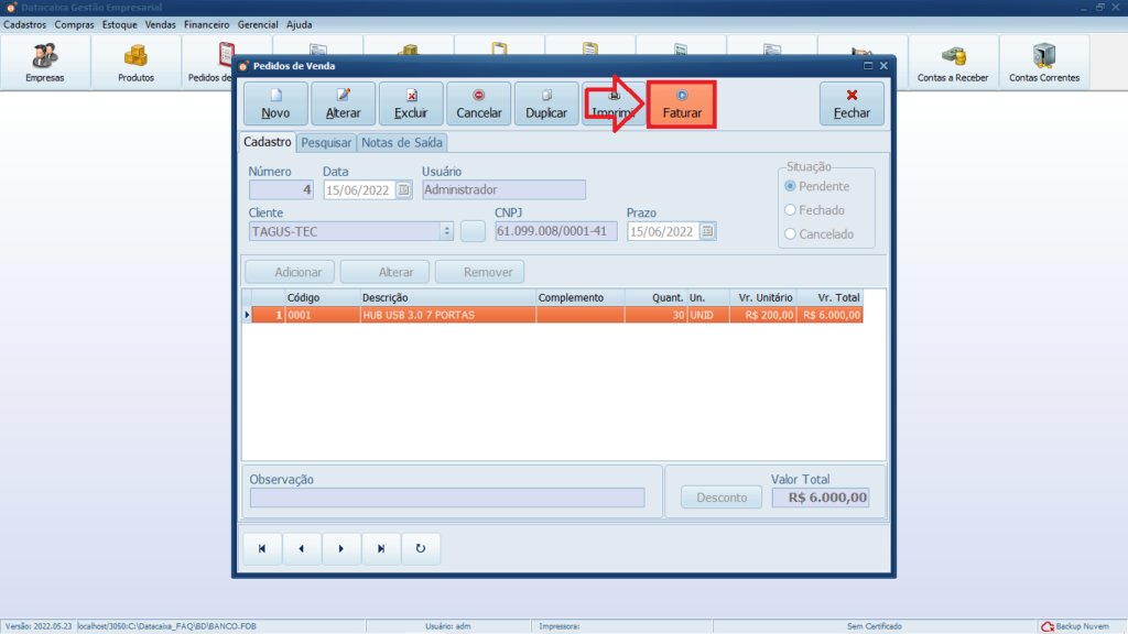 Pronto! Você faturou um pedido de venda gerando a Nota Fiscal Eletrônica, agora pode preencher as informações restantes para então Gerar e enviar a SEFAZ do seu Estado.