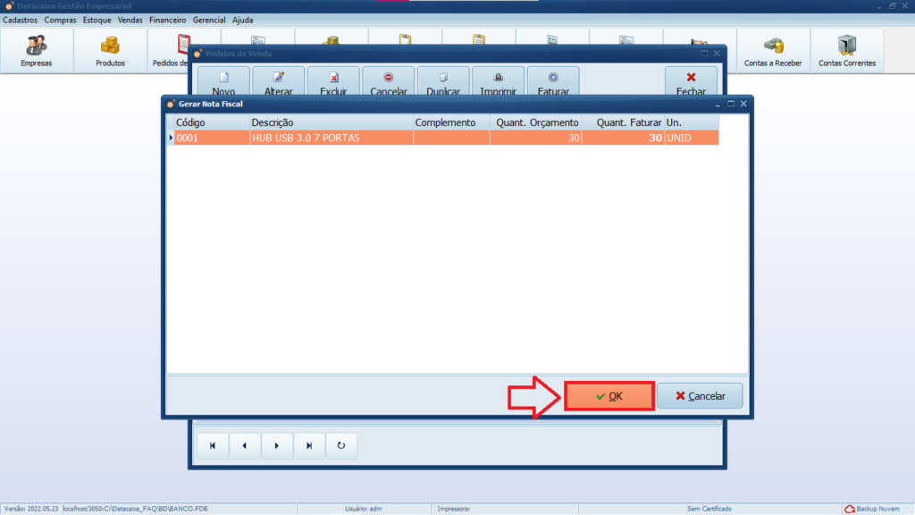 4- Confirme os Produtos que estarão na Nota Fiscal Eletrônica e clique em Ok.