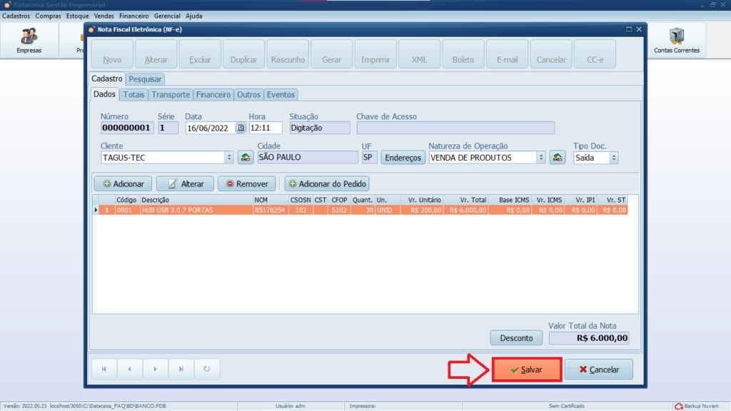 5- Nota Fiscal Eletrônica criada, clique em Salvar para registrar a nota no sistema.
