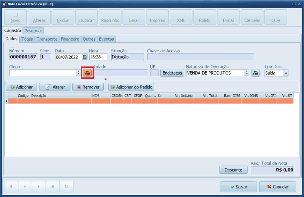 5- Caso não tenha o cliente cadastrado ainda, pode utilizar o botão ao lado do cliente para fazer um novo cadastro. Clique Aqui! para verificar o processo de cadastro de clientes no Sistema.