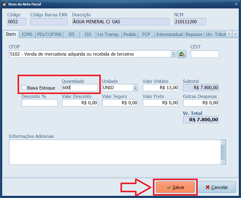 8- Caso faça controle de estoque deixe o parâmetro Baixa Estoque habilitado, coloque a Quantidade e clique em Salvar.