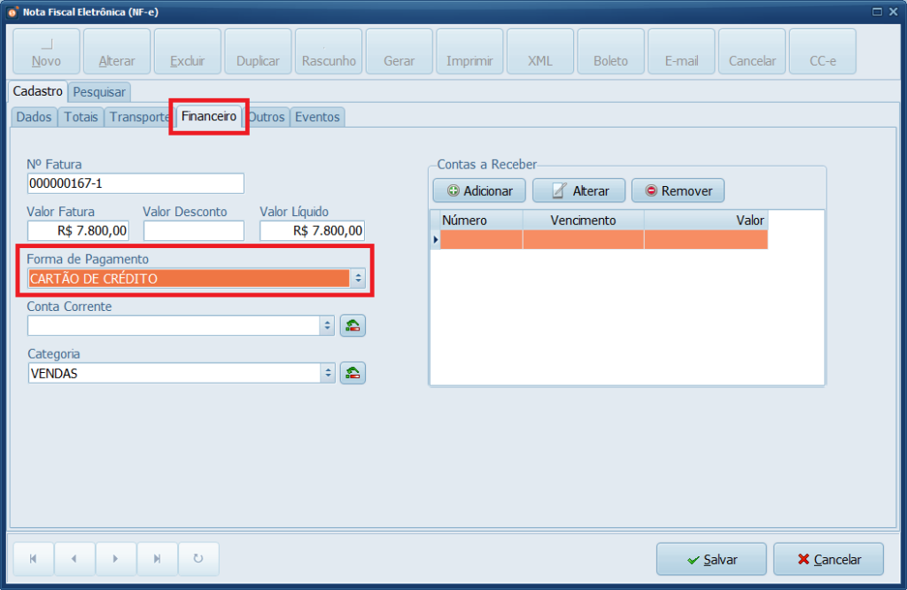 9- Na aba Financeiro, selecione a Forma de Pagamento.