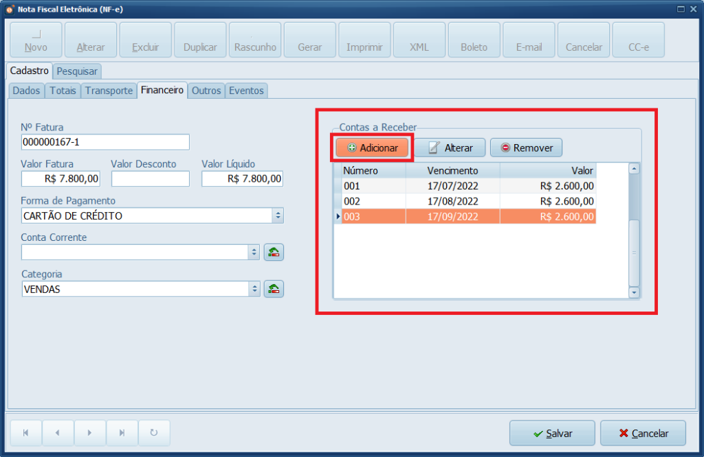 10- Em Contas a Receber, clique em Adicionar e insira o valor do pagamento e o vencimento, pode inserir um valor à vista ou parcelado como mostra o exemplo.