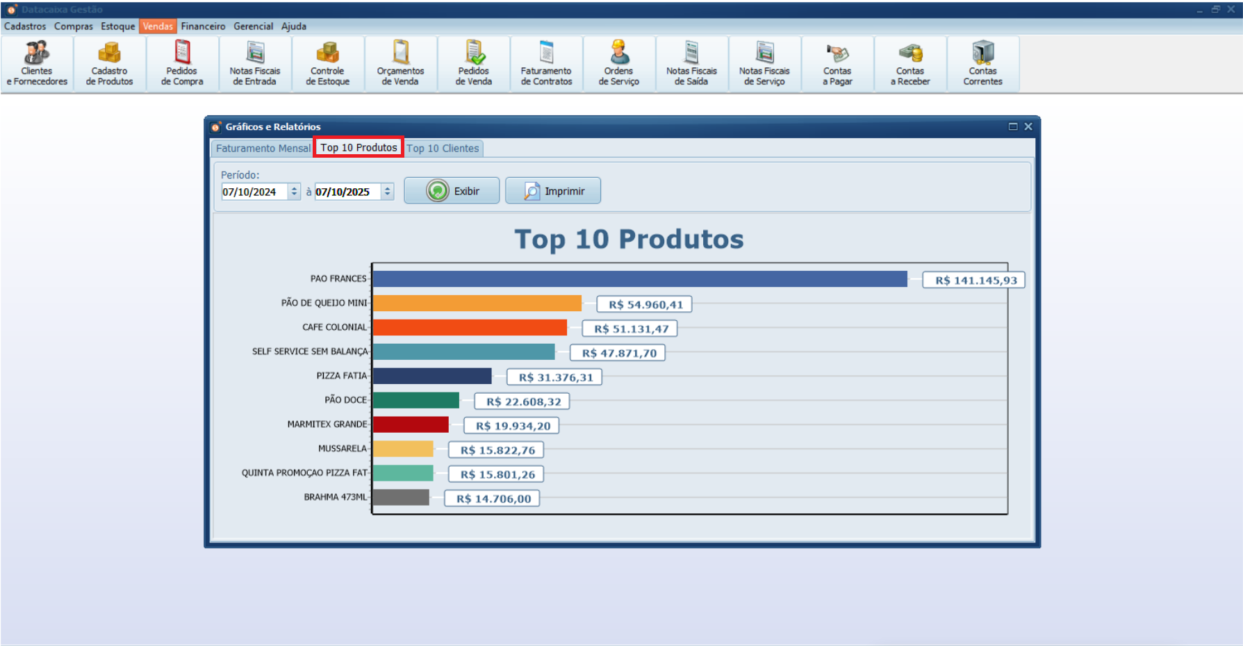 Pronto! Você gerou o Gráfico Top 10 Produtos, um ranking que destaca os itens com maior participação nas suas vendas no período selecionado.