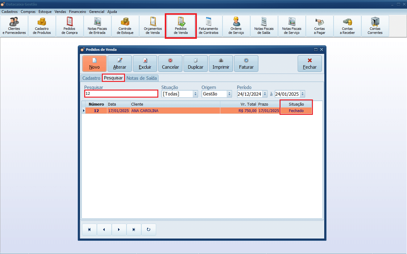 Após a emissão da NF-e, a Situação do Pedido de Venda mudará automaticamente para Fechado. Veja abaixo como consultar o Pedido.