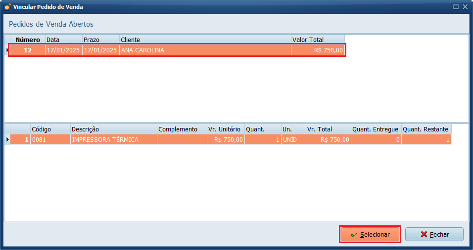 4- Selecione o Pedido de Venda e clique em Selecionar.
