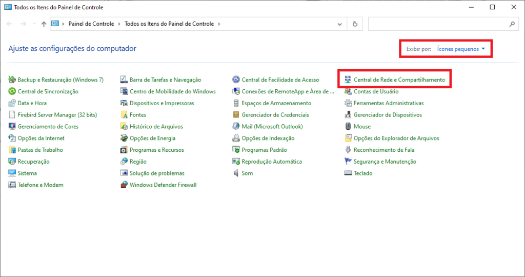 13- Altere a Exibição para Ícones pequenos e clique na Central de Rede e Compartilhamento.