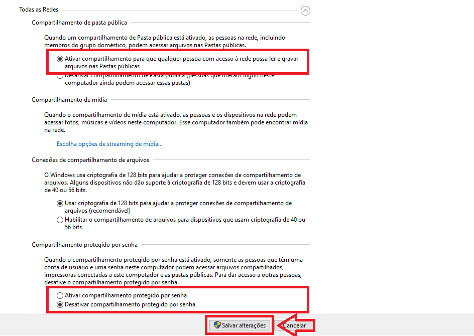 16- Habilite o Compartilhamento de pasta pública, desative o Compartilhamento protegido por senha e clique em Salvar Alterações.