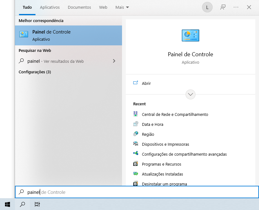 12- Na barra ou botão de pesquisa, procure por Painel de Controle e acesse.