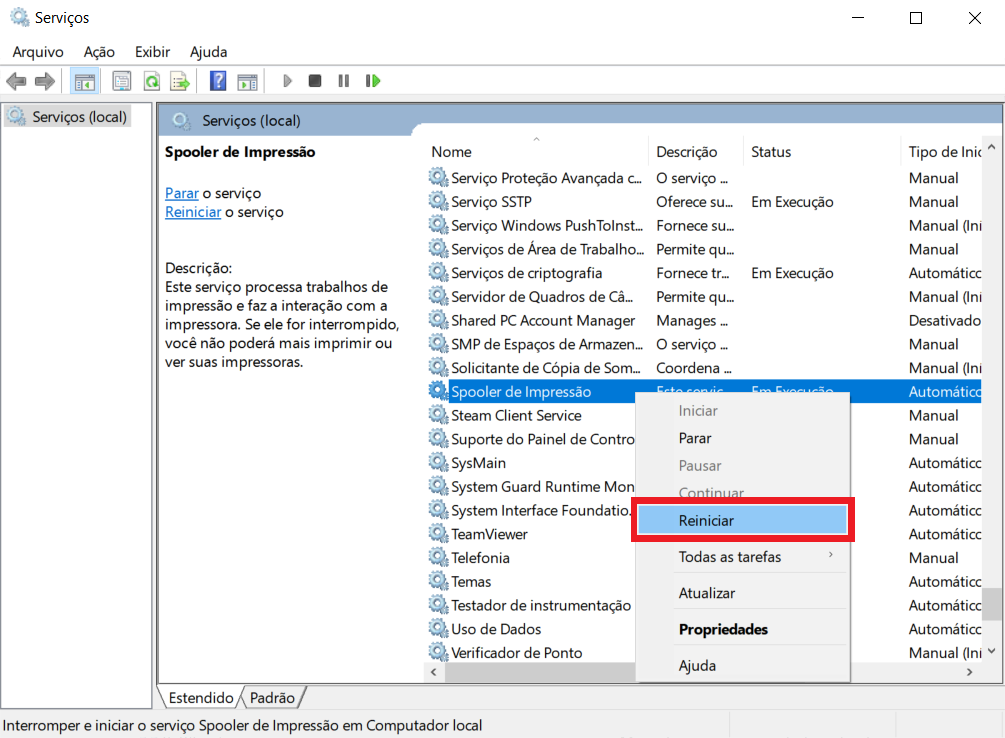 3- Clique com o botão direito neste serviço e Clique em Reiniciar.