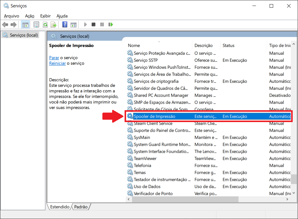 2- Procure na lista de serviços um chamado Spooler de Impressão.
