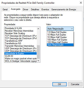 Em Propriedade procure por Velocidade & Duplex ou Speed & Duplex, e em valor verifique se existe o valor 1.0 Gbps como na imagem, se existir, em sua rede cabeada passa 1000 Mbps, se não, passa somente 100 Mbps.