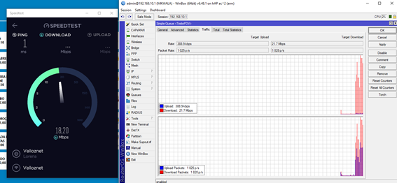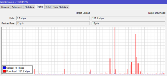 Temos um MIKROTIK no local, e uma de suas funcionalidades e verificar quanto de banda está sendo utilizada em uma determinada rede, realizando um teste de velocidade verifique que a banda utilizada aparece no registro do roteador.