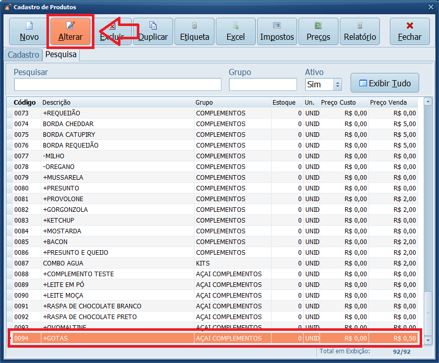 Pronto! Você alterou o cadastro de um complemento no Sistema.