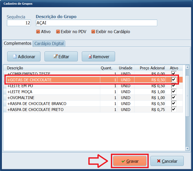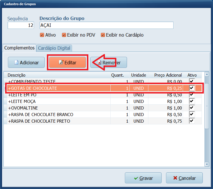 Se já trabalha com complementos e precisa atualizar o preço de um complemento inserido no grupo, realize o processo abaixo.