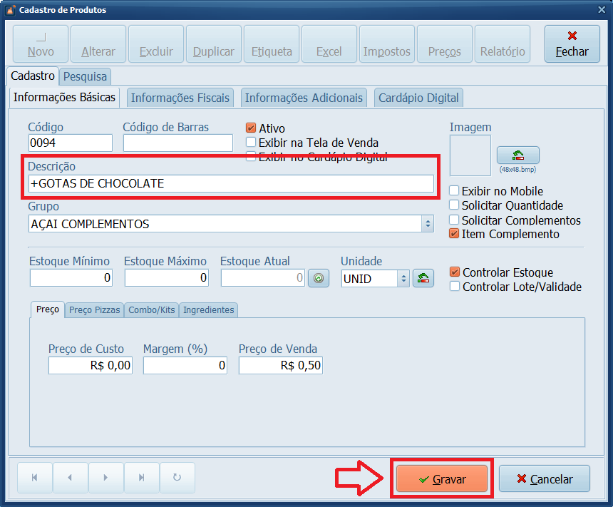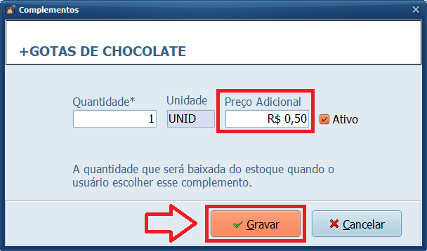 3- Atualize o Preço Adicional e clique em Gravar.