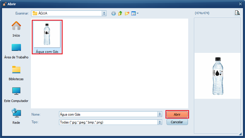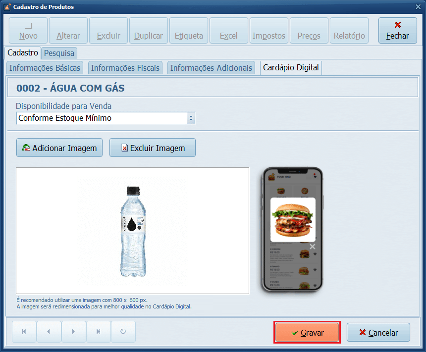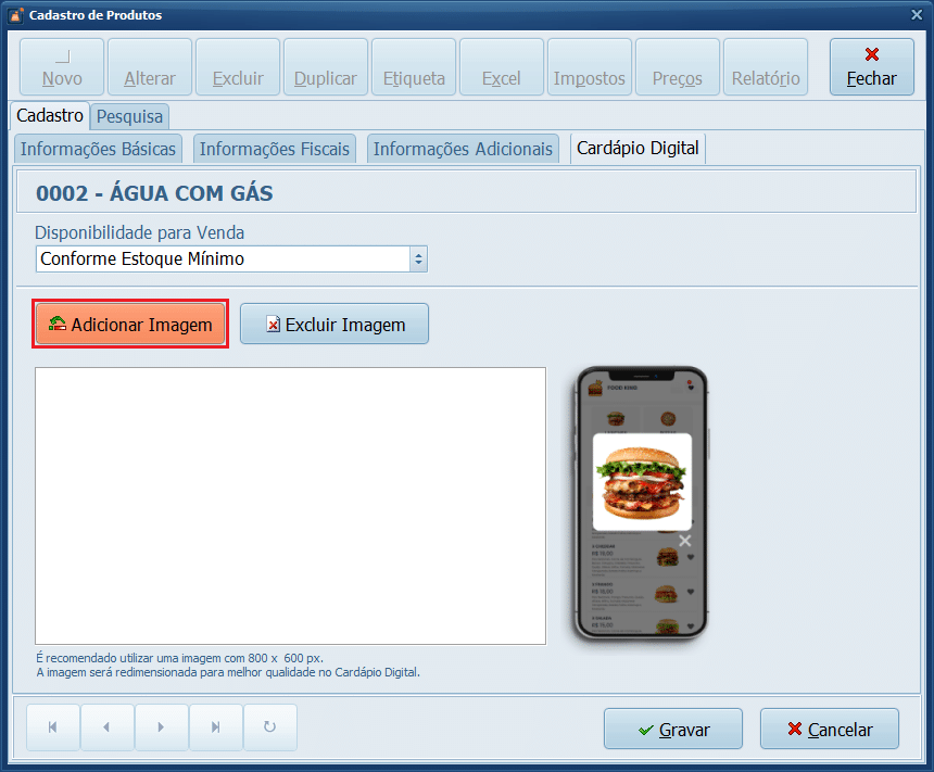 15- Clique em Adicionar Imagem, selecione a foto do produto e clique em Abrir. E, após definir todas as opções necessárias, clique em Gravar.