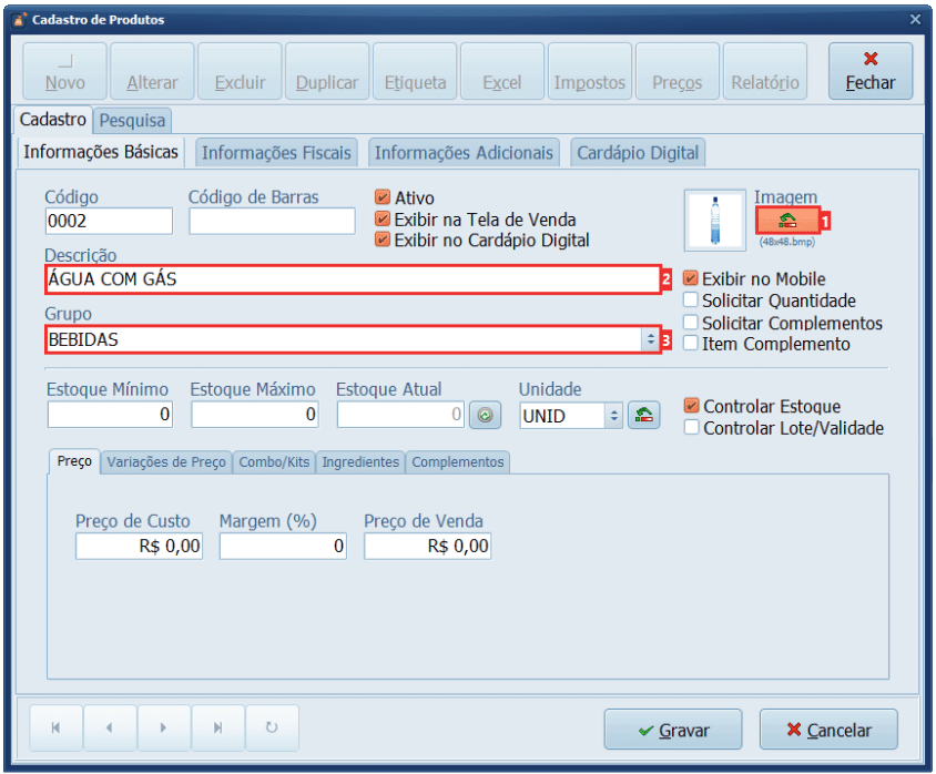 4- Se desejar, insira uma Imagem para este produto. Em seguida, preencha a Descrição e selecione o Grupo deste item.