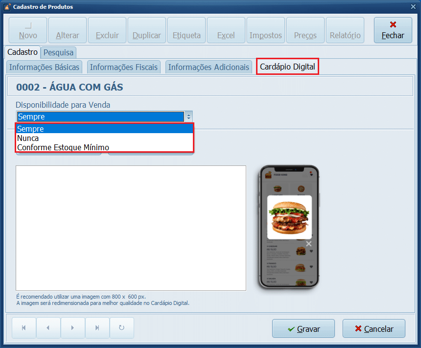 14- Clique em Disponibilidade para Venda, defina se este produto estará Sempre disponível, Nunca disponível ou disponível Conforme Estoque Mínimo no Cardápio Digital.