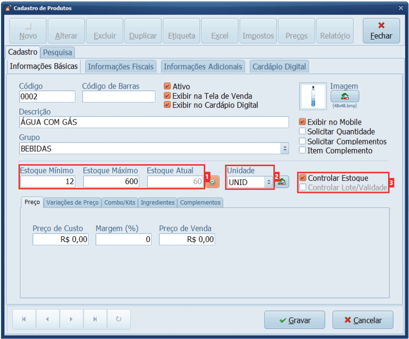 - Estoque Mínimo – Indica a quantidade mínima que você deseja manter em estoque. Quando o produto atinge essa quantidade, o sistema alerta para reposição.