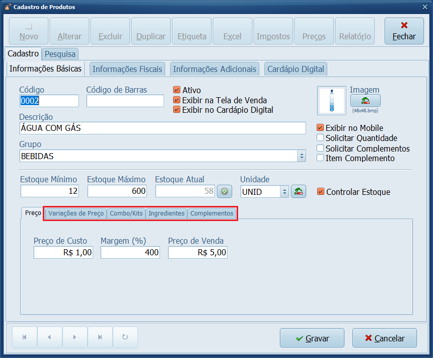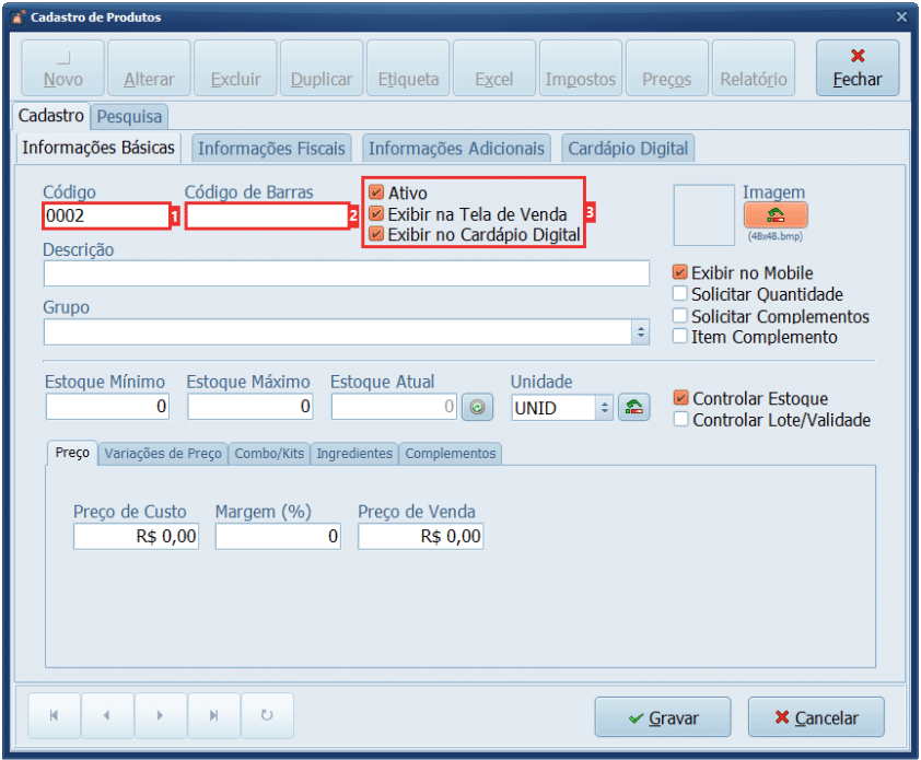 - Exibir no Cardápio Digital – Indica se o produto será exibido no Cardápio Digital, permitindo a venda do item através dessa plataforma.