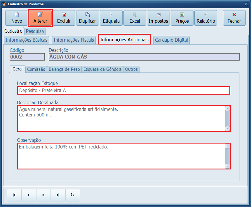 9- Clique em Informações Adicionais > Alterar. Em seguida, Insira as informações do produto de acordo com suas preferências.
