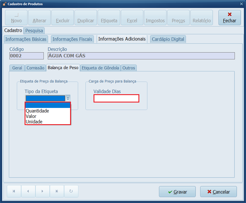 - Tipo da Etiqueta (Balança) – A opção indica qual cálculo o sistema fará ao ler a etiqueta pesável deste produto.