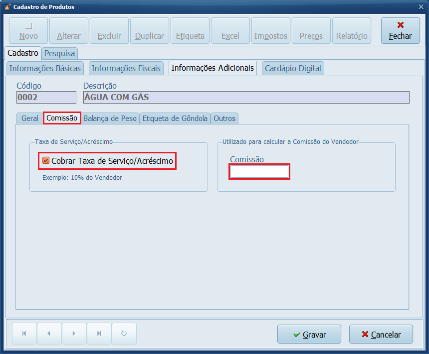 - Cobrar Taxa de Serviço/Acréscimo – Esta opção indica se o sistema aplicará a taxa de serviço ao produto. Se marcada, o sistema incluirá essa taxa nas vendas.