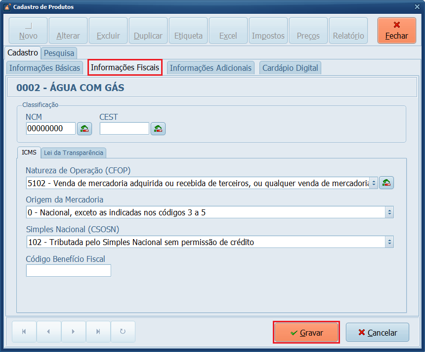 8- Clique em Informações Fiscais. Caso necessário, atualize o NCM, CEST, CFOP e CSOSN, depois clique em Gravar.