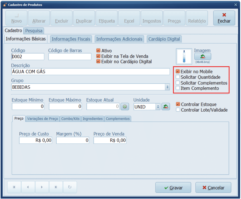 - Exibir no Mobile – Quando esta opção é marcada, o produto fica visível na Comanda Mobile, e o garçom poderá lançar o item nas Mesas e Comandas pelo aplicativo.