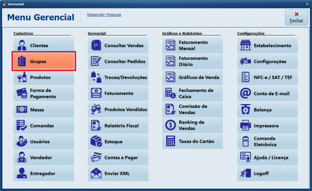 1- Acesse o Menu Gerencial e clique em Grupos.